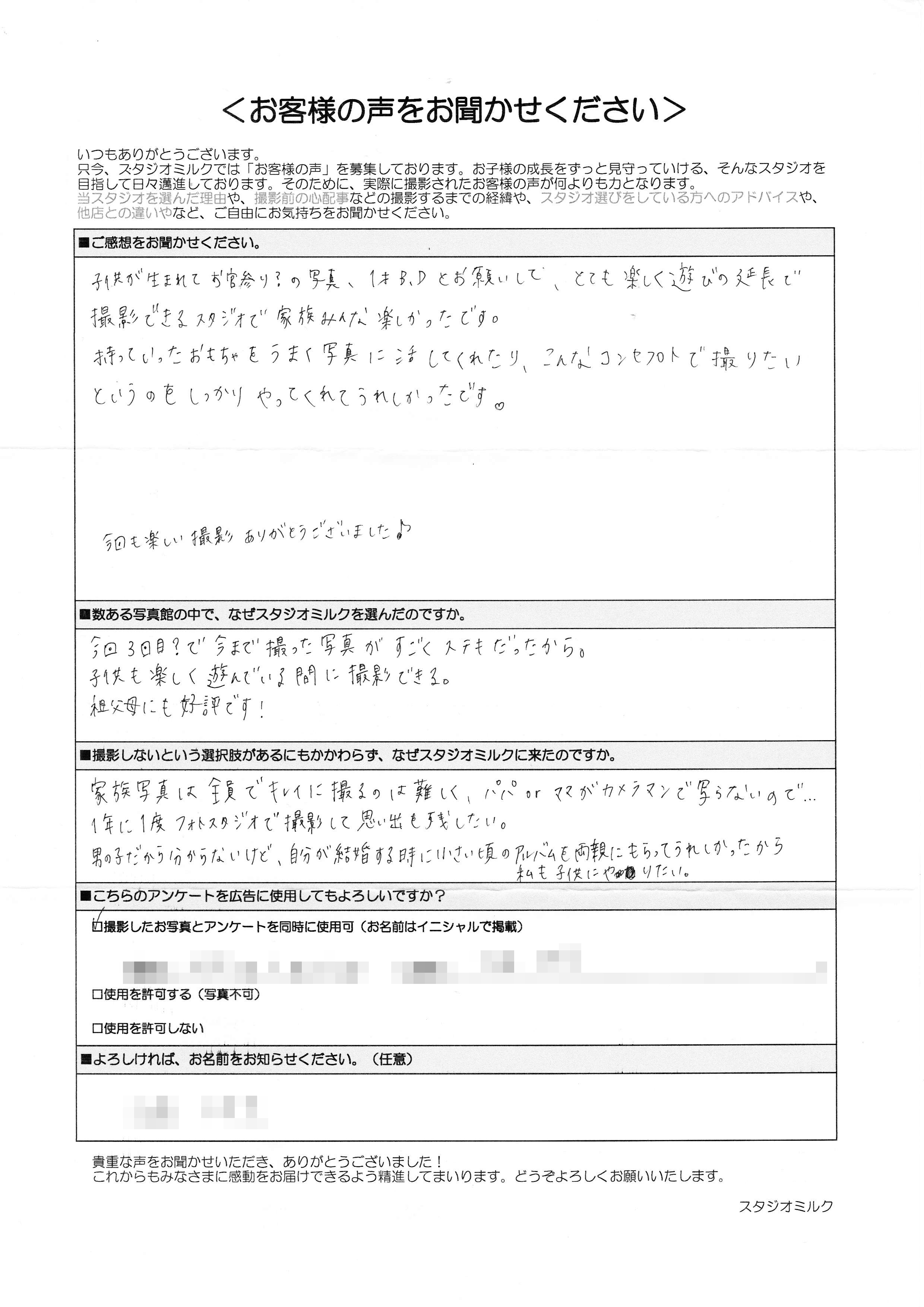 【お客様の声】スタジオで写真を撮ってもらうという経験自体が家族の良い思い出