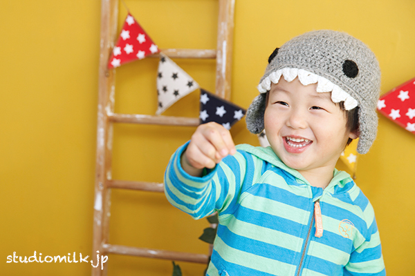 サメの帽子と、ポップな黄色の背景が合ってますね(^ ^)