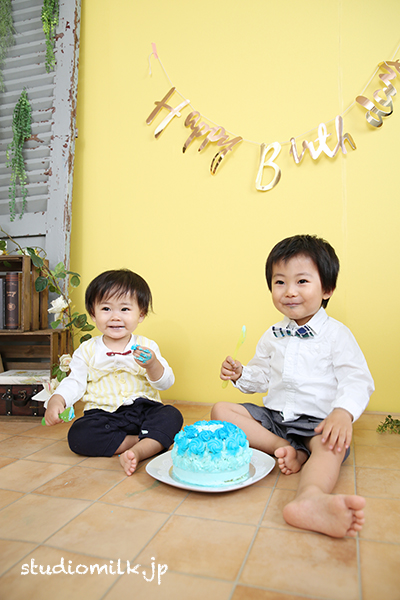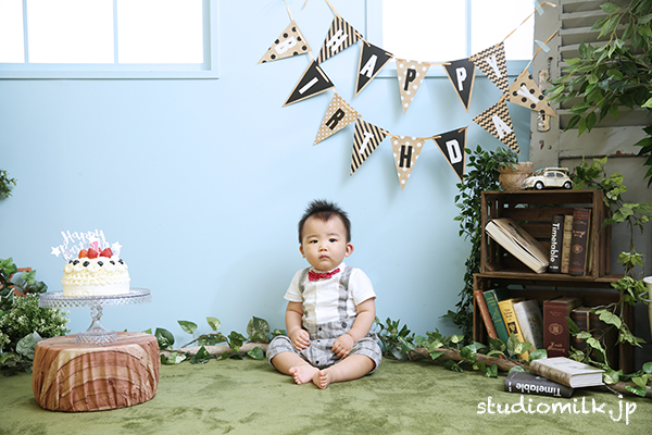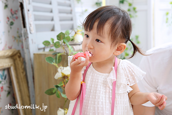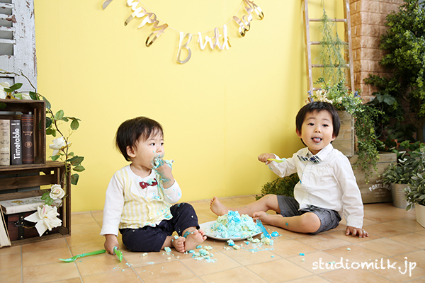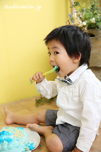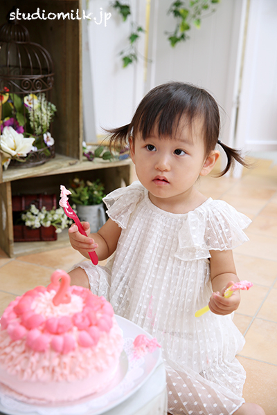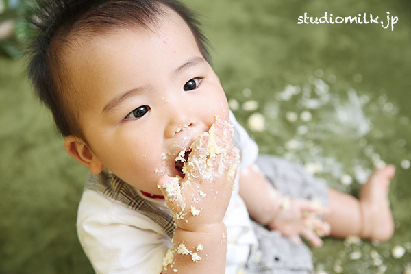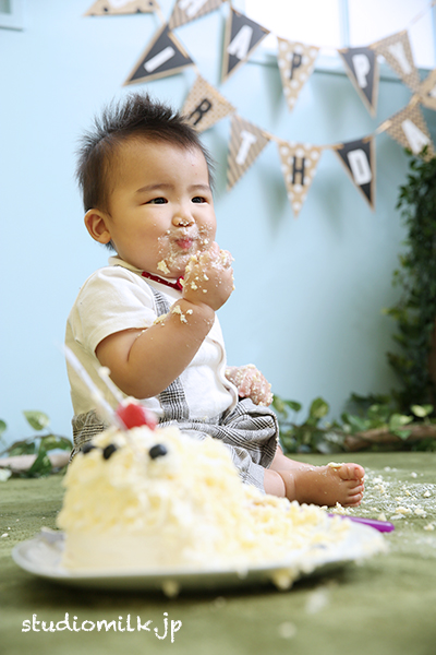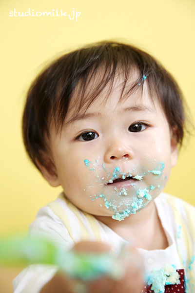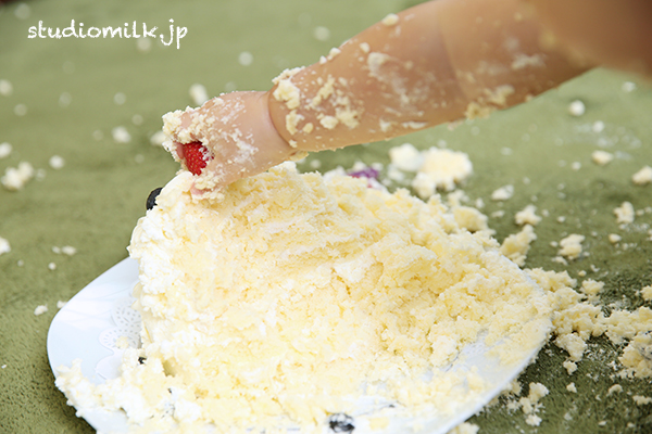1歳のお誕生日にケーキを好きなように崩しながら食べたりする撮影です(^^)